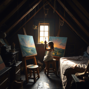Raka membukanya perlahan. Lukisan itu menggambarkan seorang perempuan muda bergaun putih berdiri di depan rumah yang sama—rumah kakeknya. Tapi yang membuat bulu kuduk Raka merinding: wajah perempuan itu sangat mirip dengan ibunya yang sudah meninggal.
